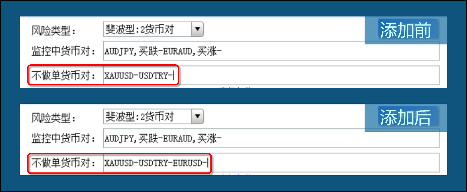 (2)币种和多空方向都是机器人分析,用户只能够设置【不做单的货币对】,不能设置【监控中货币对】。