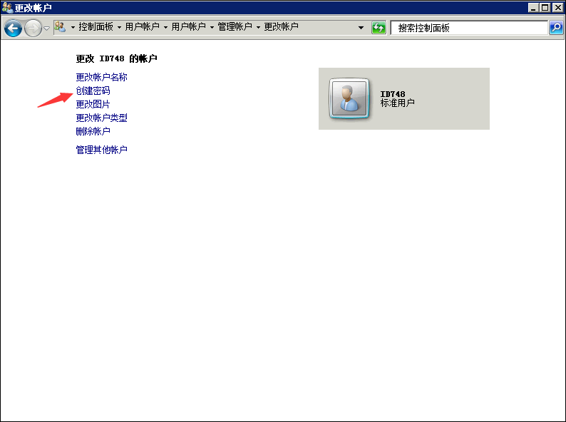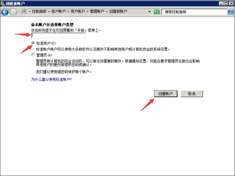 3,输入账户名称(用于登录服务器),选择标准用户,点击创建账户